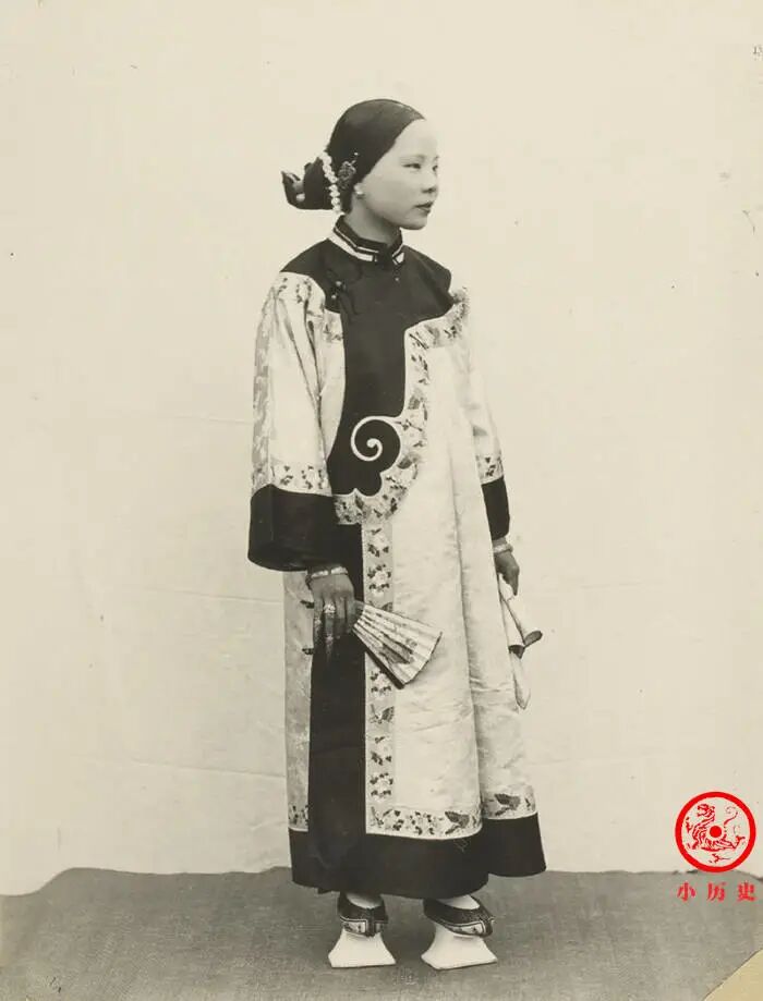 这位女子头发梳得一丝不乱,身穿氅衣,脚穿马蹄底鞋,显示出了她优越的家庭条件。