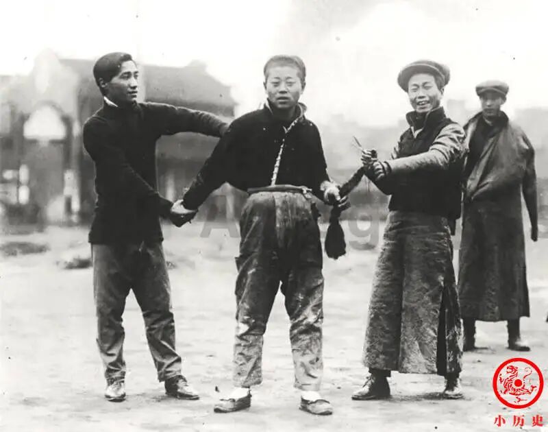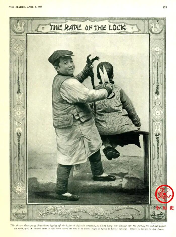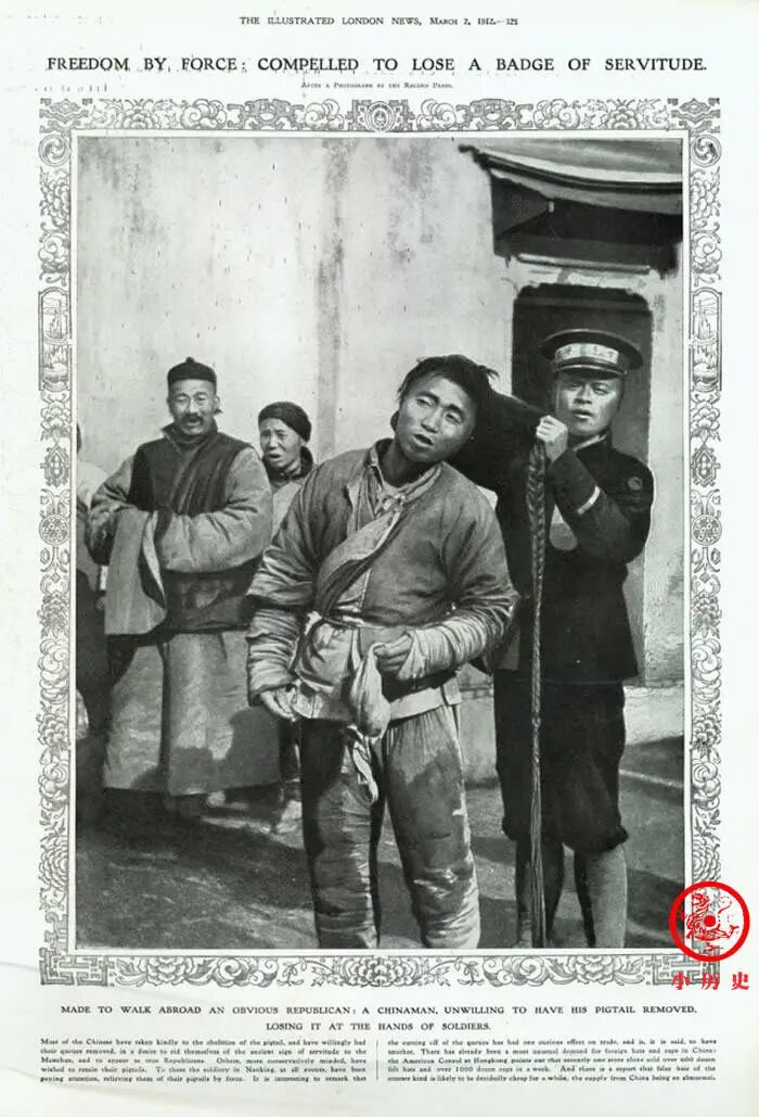这张照片刊登在1912年某日《伦敦新闻画报》的封面上,记录了南京街头的一个真实剪辫事件。被剪掉发辫的人表情沮丧痛苦,目光躲避镜头。也许他曾试图逃跑,结果那名士兵牢牢抓住了他。