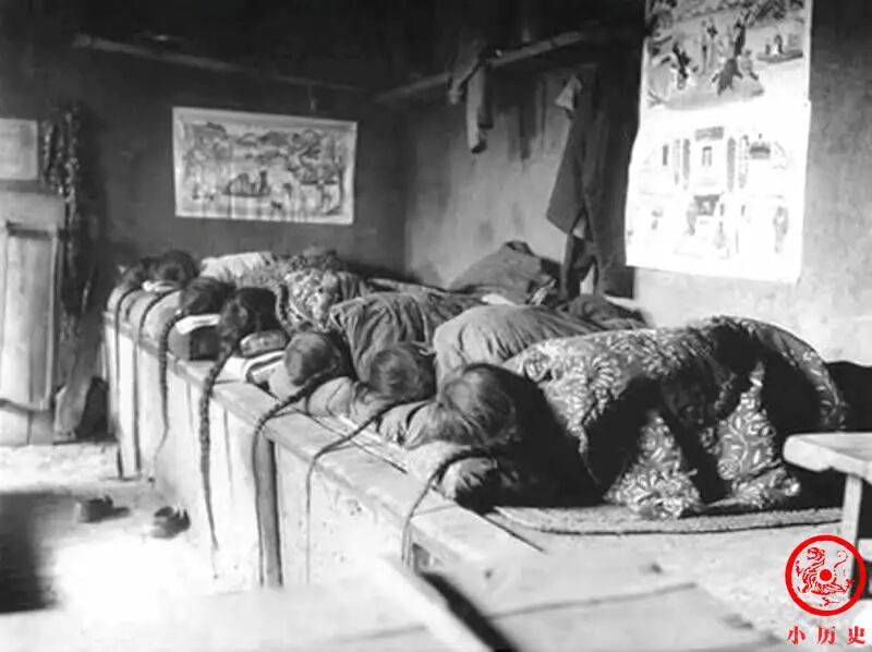 劳作时,发辫垂下来,碍手碍脚,还容易夹到车轮里;缠在脖子上,容易卡喉。经过摸索,人们发现盘在头上比较靠谱。睡觉时怎么放辫子呢?下面这张照片作了回答。