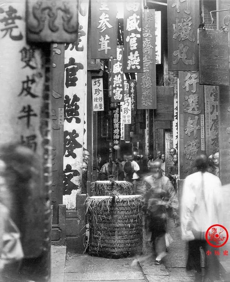 商家挂出各种药品、补品的招牌,琳琅满目。十八甫位于广州西关,18条商业街相连,人来人往,熙熙攘攘,十分热闹。晚清多位摄影师都到此地拍摄过街市繁盛的面貌。