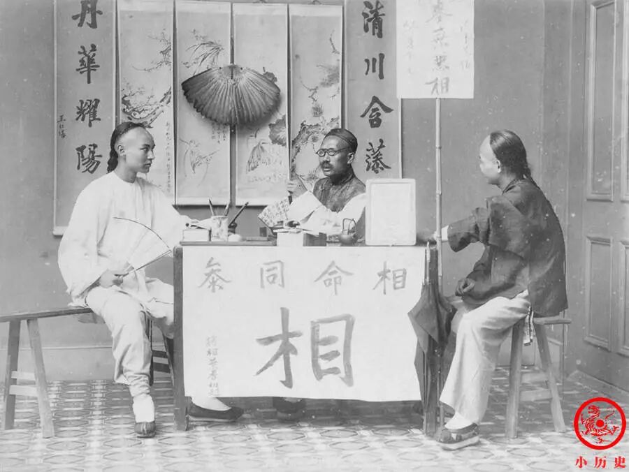 照片中算命先生戴着西洋眼镜,鼻下贴两撇假胡须,装扮和表情十分夸张,颇具喜感。他们身后“清川含藻景,丹华耀阳林”的对联藏有耀华照相馆的名字,富有趣味。