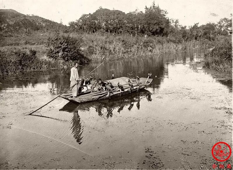 船舷上站着一群鸬鹚(俗称鱼鹰),这位妇女不用撒网,依靠这些经过严格训练的鸬鹚就可以喜获丰收。它们可以潜入3至4米深的水中,捕到超过自身体重一倍以上的大鱼。我相信在江南一带长大的小伙伴都见过这个场景。