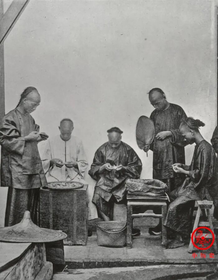 一家茶厂销售一批茶叶之后,几名工人在检查所收银两的成色,并计算重量。清朝各省铸造银两的标准并不完全统一,在实际流通过程中需要交易双方鉴定成色,以免掺杂掺假。