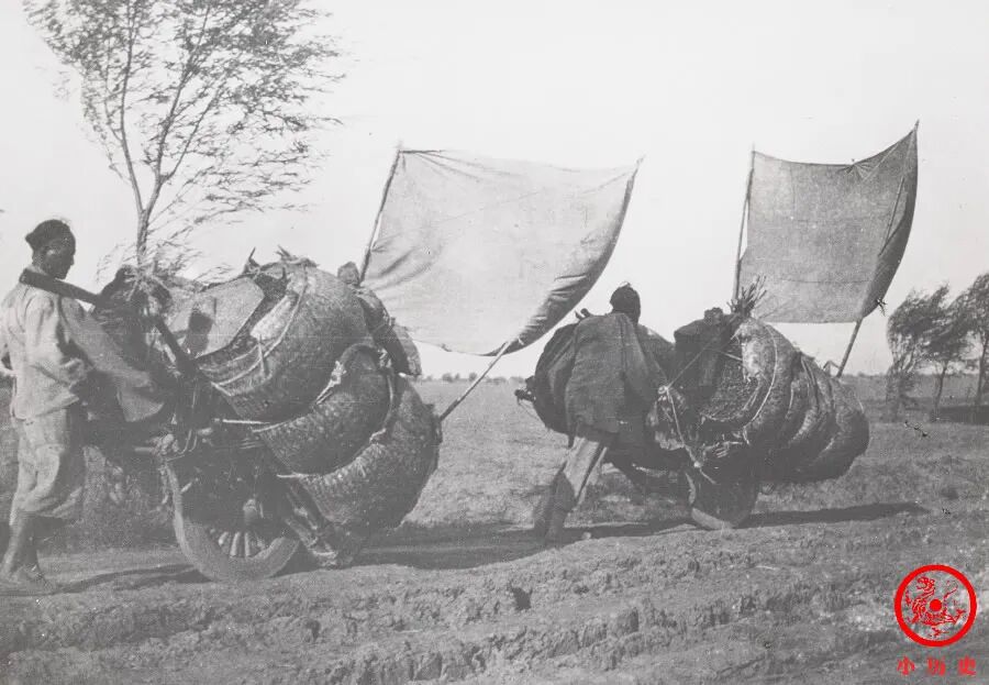 独轮车载运着这么大体量的货物,要稳稳地在坎坷的泥土路上推行确实不容易。当然,车夫也有车夫的小智慧,他们借鉴了帆船的原理,也给车子安装了风帆,借助风力前行,想必能省不少力气。