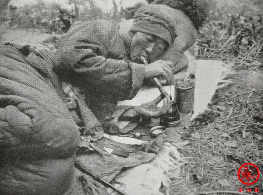照片中的人物被标注为Chinese soldier(清军士兵),拍摄地点是Kuchengtze(古城子?),他在执行护卫任务途中吸食鸦片。这样的士兵,你能指望他在战场上奋勇杀敌吗?他深受毒害,已经没有那个体格!激战正酣的时候,烟瘾犯了,岂不坏事?