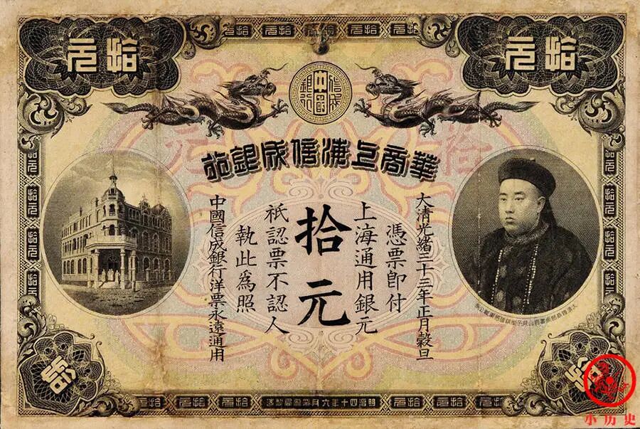 1907年,载振的仕途达到顶点,其个人肖像被印上了清朝发行的第一批纸币,当年获得这个待遇的人物还包括慈禧太后、李鸿章。为什么年纪轻轻的载振能和慈禧、李鸿章并立出现在纸币上?一方面因为发行纸币是与农工商部有关的一项业务,印上尚书头像说得过去;另一方面,他的父亲奕劻时任首席军机大臣,在朝廷中权势熏天,下面办事的人有通过载振巴结奕劻的动机。