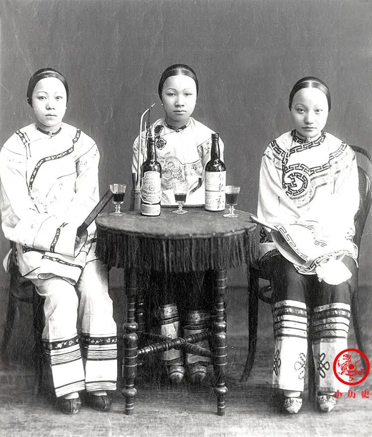 照片中三位面容姣好、装扮精致的年轻女子围坐在放置洋酒和烟具的桌子旁,塑造了一个满足西方对晚清社会猎奇的场景。大家注意她们的服装,是晚清很时髦的袄裤,相比于传统的女性服装形式大幅收窄,更能体现苗条身材。