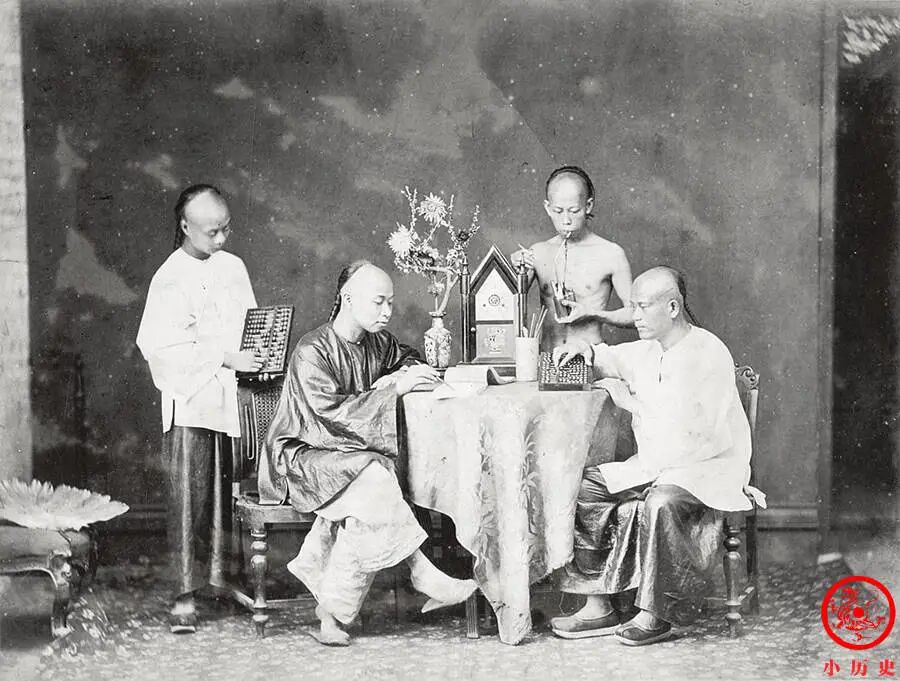 晚清以账房先生为题材的摄影作品非常罕见,它是照相馆为迎合西方人对中国文化和传统的好奇而摆拍的。照片中一人在记账,两人敲打算盘,另有一人在抽烟。