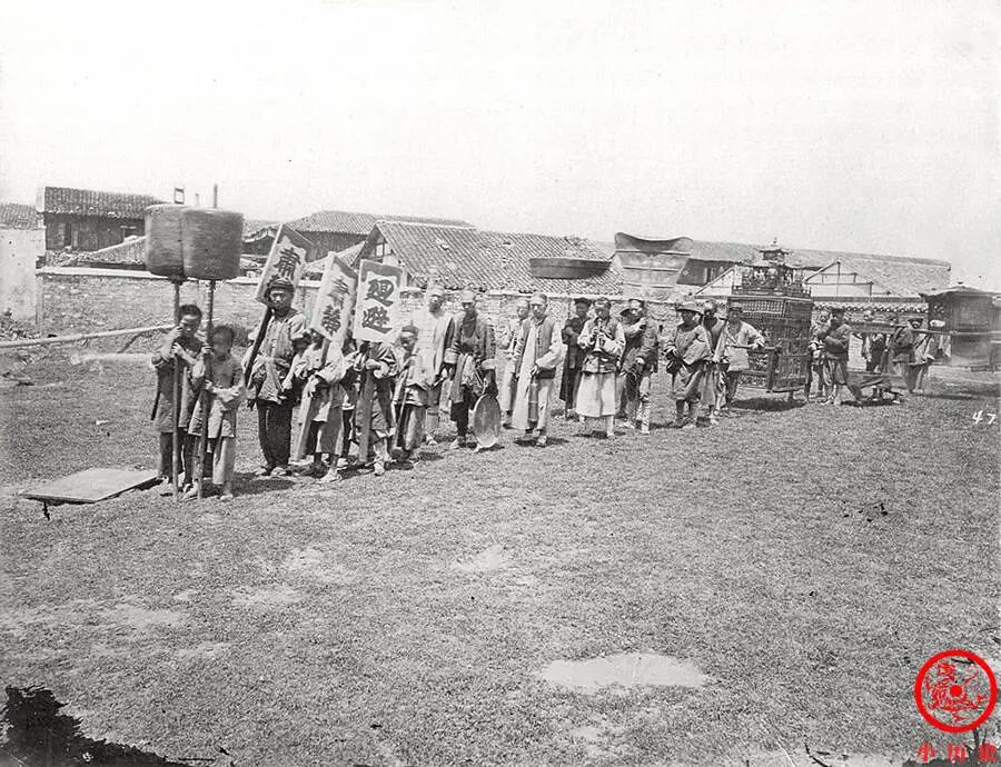 作为一张摆拍的照片,这个场面算是很浩大了。照片中随行人数众多,花轿豪华,是反映晚清民俗风景的佳作。“肃静”“回避”等牌子为官员出巡时专用,但民间结婚当天也可用一次。