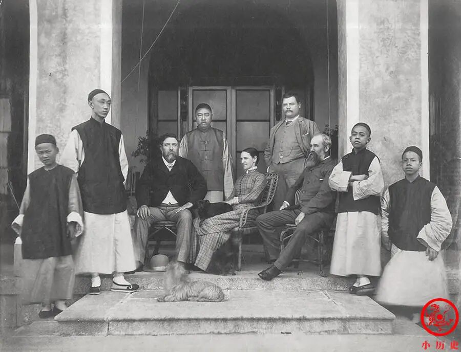 洋行就是早期的外企,依靠不平等条约享有很多特殊权利,挤压民族企业的生存空间。照片中的人物是洋行老板与雇员的合影,其中有两名年纪很小的童工伙计。