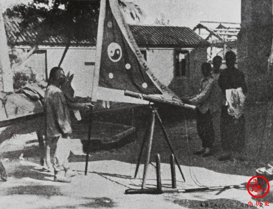 义和团的出现并不是偶然的,有三个大背景:一是列强加紧侵略中国;二是清廷统治腐败,民生凋敝;三是华北遭遇水旱灾害,粮食歉收,饥民遍地。其打出“扶清灭洋”的口号,但并没有统一的组织,也没有统一的旗帜。照片中的旗帜画着太极图,带有浓厚的民间信仰色彩。