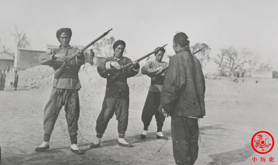 照片拍摄于Tengchow(通州?滕州?),时间未知,三名士兵正在教官的指导下练习装填弹药。你能认出他们使用的步枪是什么型号吗?