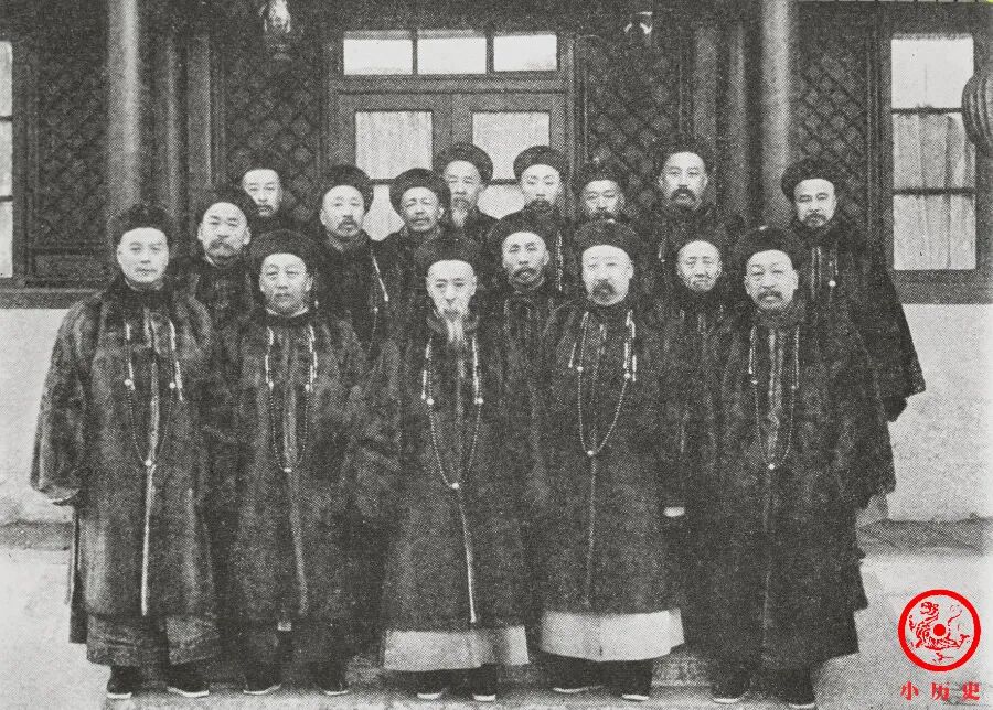 前排右三为庆亲王奕劻,总管外务部事务;前排右二为那桐,时任外务部会办大臣。清廷外务部管辖的范围极广,除了负责一切对外交涉的事务,还管理有关通商、海防、路矿、关税、邮电等事务。