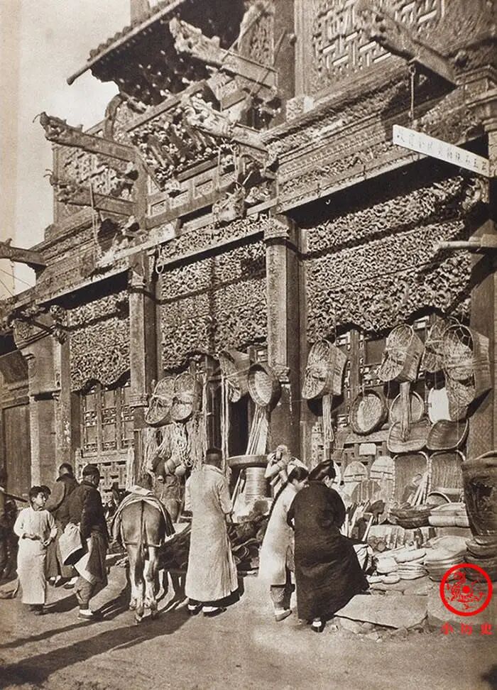 店铺门外摆着竹篮、竹筐、笸箩等日常生活所用的竹制品,很多顾客驻足挑选。它的门面十分精致,木刻装饰堪称艺术品。