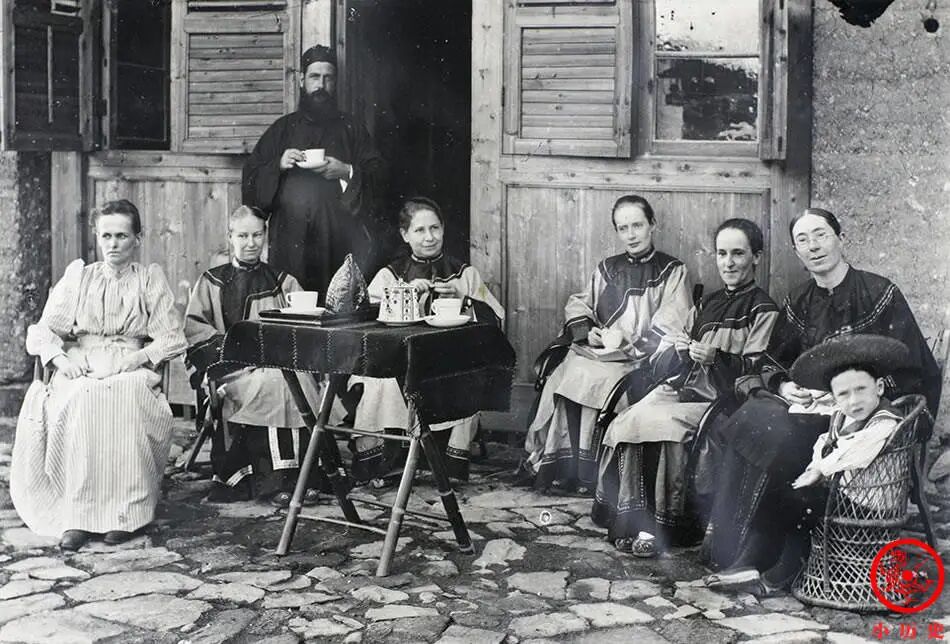 站着的男子是传教士威廉·班尼斯特,最右侧的成年女子是他的夫人。除了左一女子,他们都穿着当地百姓的服装,这样的装扮象征着对中国的“归化”,容易赢得信任,便于与当地百姓打交道。