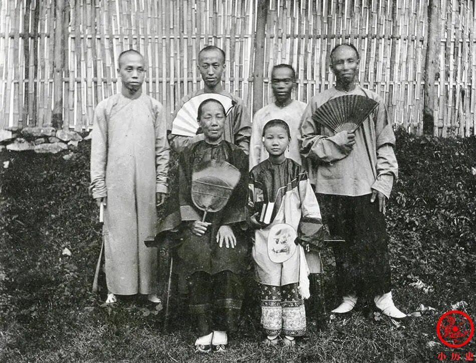 看他们的着装,还算整洁干净,家里有一定的经济实力。坐着的老妇不裹小脚,没有受到“金莲审美”的毒害,真是幸运。