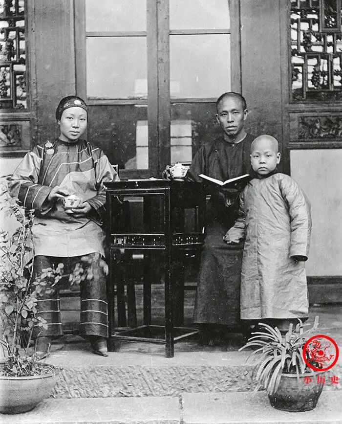 看照片的拍摄环境和人物着装,这个家庭的经济条件比较优越。女主人裹小脚,穿很时髦的袄裤。嘉庆、道光之前,汉族妇女服饰沿用明朝服装形制,以衫裙为主,式样宽大。从光绪年间起,裤子开始流行,妇女穿裙的逐渐少见,式样也逐渐收窄,身材曲线更加突显出来。