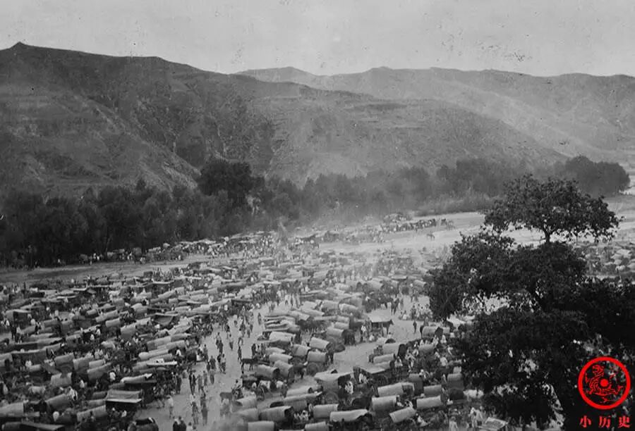 山谷里停了这么多马车,真是壮观。人们汇聚于此,可能是赶集、听戏或者赶庙会。一时之间,停车位显得有点紧张,晚到的只好停在外围了。等到散场的时候,路上也会堵得一塌糊涂。