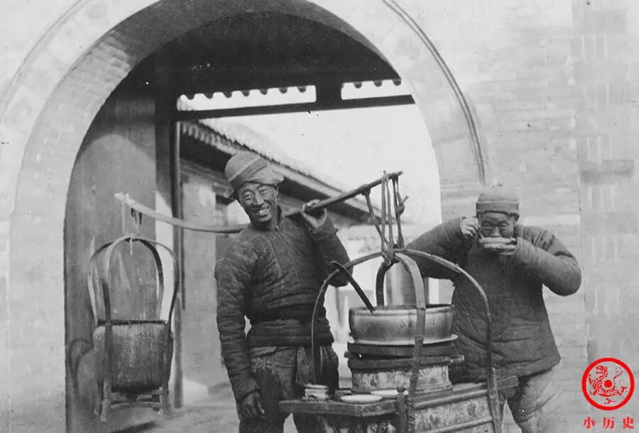 从清朝后期流传下来的影像资料来看,当时各个城市流动经营的个体商贩非常普遍,挑着扁担走街串巷做小买卖,赚一些铜板养家糊口。照片中那位顾客吃得很投入,不知是什么美食?