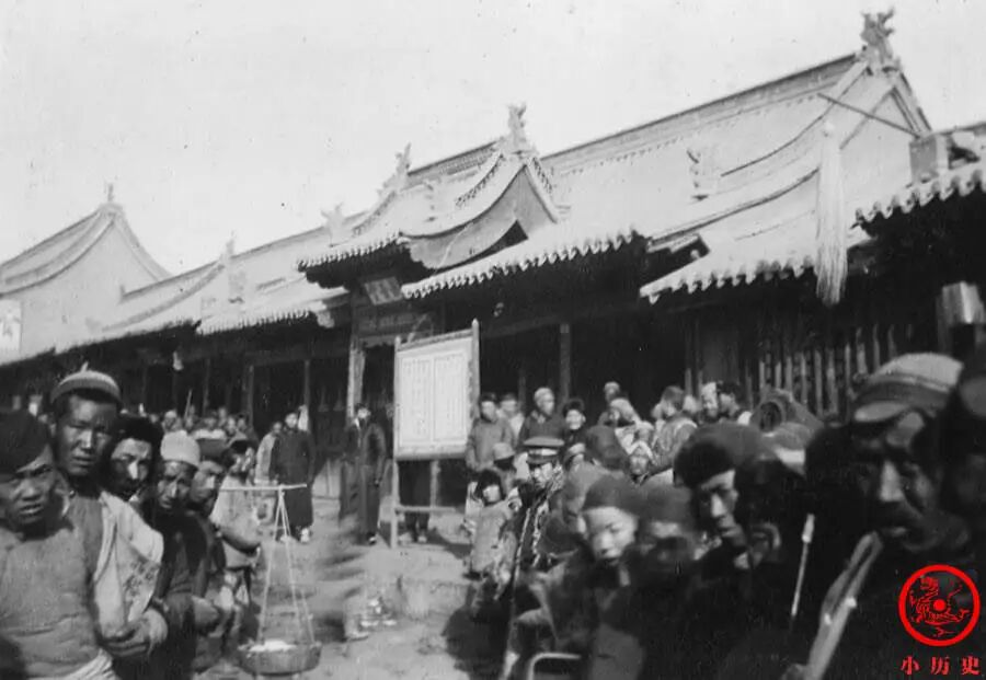 以前普通百姓接受来自官府的公告,主要是通过街头的布告牌(栏)。布告牌前识字的人会大声读出上面的内容,广而告之。此时此刻,这些群众齐刷刷地看向镜头,显然是对带着照相机的外国人感到好奇。