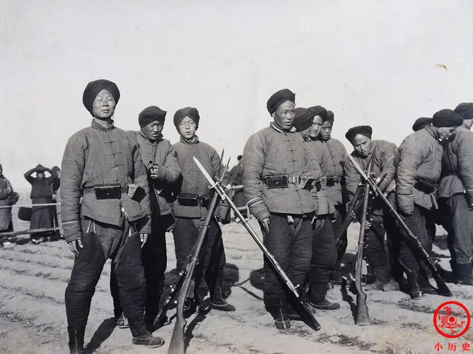 这些人不属于北洋新军序列,根据其服装判断,应该是勇营。他们所使用的武器是装了刺刀的毛瑟步枪,在当时算得上先进武器。清军自19世纪末20世纪初开始大规模装备毛瑟枪。