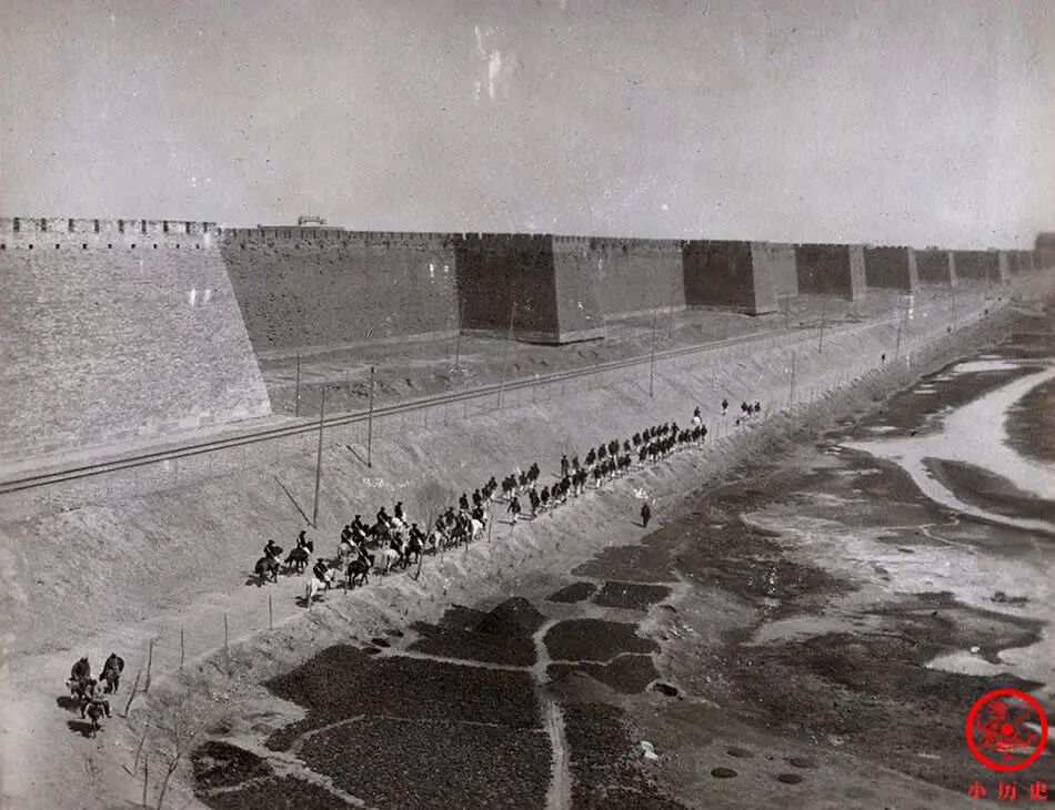 你从这张照片能看到什么?铁路、电线杆、干涸的护城河、一队军人……曾有网友问过,城墙每隔一定距离突出的墩台起到什么作用?那些墩台俗称“马面”,当敌人来袭的时候,守卫的军人可以从多个角度反击,消除城下死角。