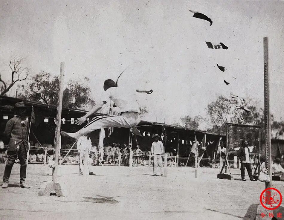 这是一个很有趣的场景,男子跳高的一瞬间大辫子高高飞起,在空中划过一道弧线。做运动或干活的时候,男人的大辫子可能会成为小小的障碍,常常将其缠在头上。