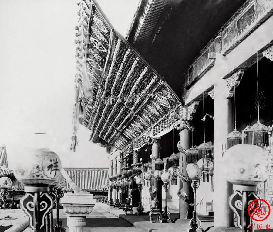 照片中坤宁宫搭设着彩棚及灯笼,显示出喜庆的气氛。溥仪大婚时,洞房就设在这里。康熙帝、同治帝、光绪帝大婚时洞房也在此处。