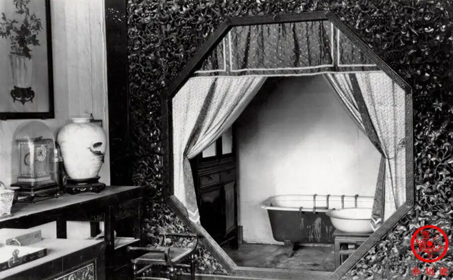 慈禧太后年轻时曾居住在储秀宫,并在此生下同治皇帝。后来婉容居住其内,并在装修陈设中融入西洋元素。照片中八方罩内摆放着浴缸和洗脸盆,这里是婉容日常洗浴之处。