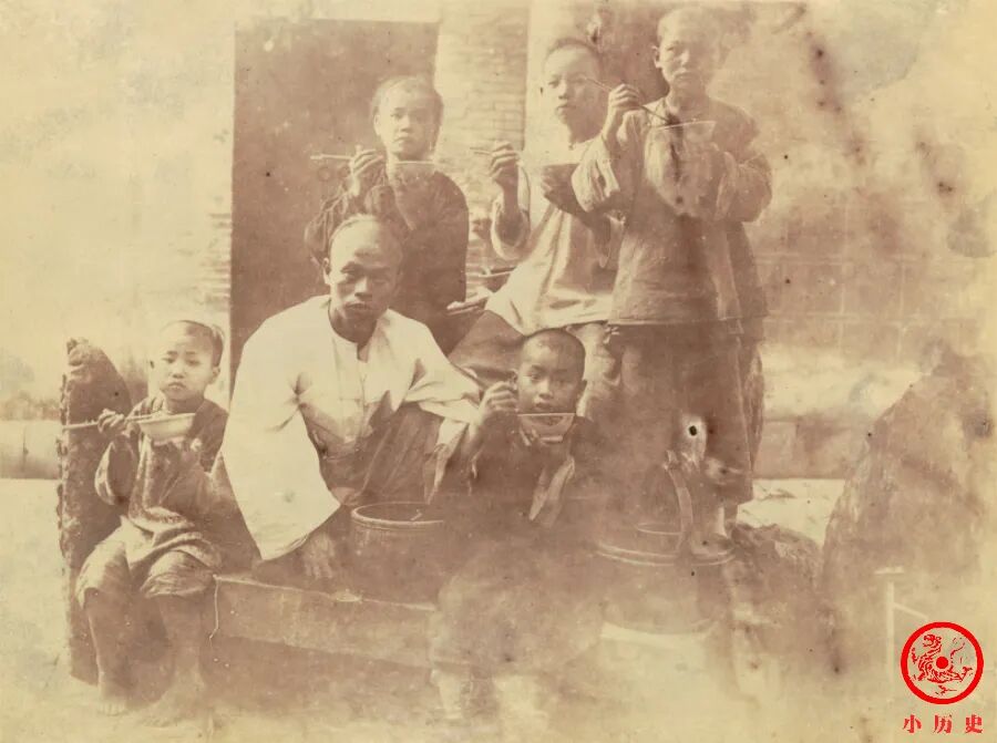照片的文字说明是“男子和他的家庭”,但5个孩子年龄相仿,并非都是他的孩子,他可能只是暂时承担着照顾这些孩子的责任。他们的午饭只有粗糙的米饭,非常简陋,勉强果腹。
