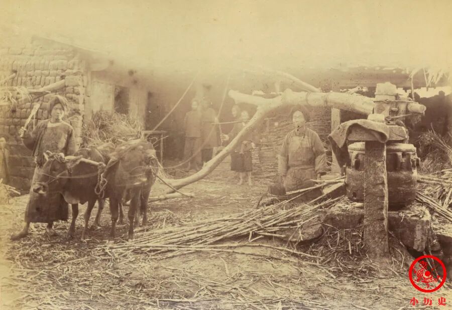 农民们将甘蔗榨汁,然后制糖。两头牛拉动压榨机,这种方式可谓传统。清朝时期,福建是重要的甘蔗产地,“出福州以上皮节红而淡,出泉、漳者皮节绿而甘”。由此熬出来的糖品质也很高,深受欢迎,“居民研汗煮糖,泛海鬻吴越间”。