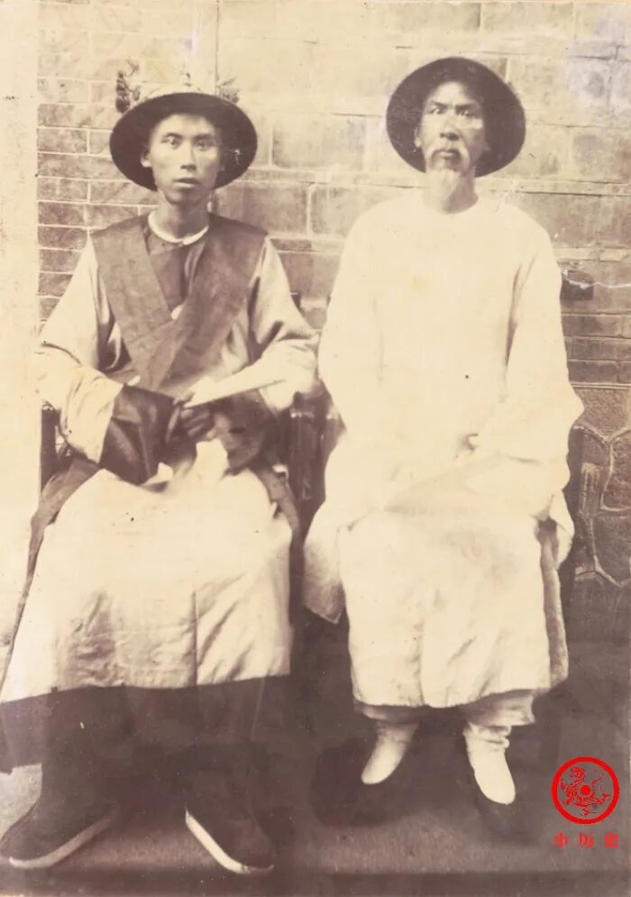 年轻男子穿靴子,身任一定的官差。老父亲很有意思,当摄影师摁下快门的一刹那,他受到了惊吓,瞪大了眼睛,头也偏向一边。