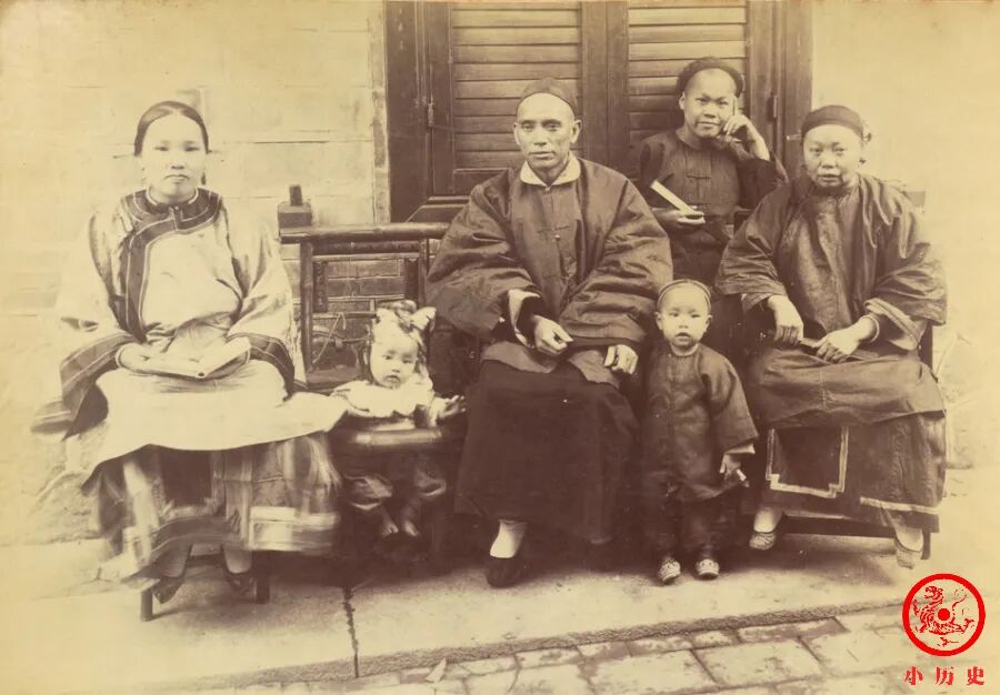 一家三代六口人,脸上都洋溢着微笑,满满的幸福感。他们衣装整洁光鲜,显然家境殷实,经济条件优渥。男主人很可能是经商之人;女主人手里捧着一本书,看来也能识文断字,实不多见。