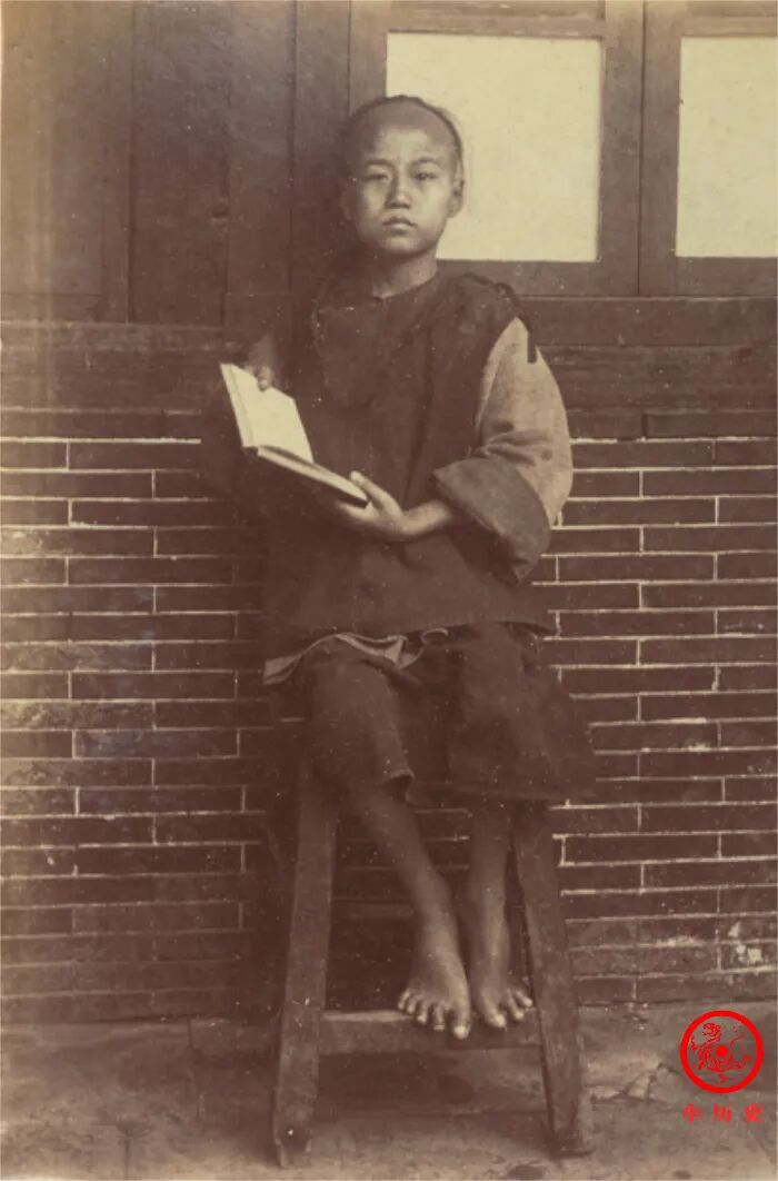 赤脚男孩坐在高脚凳上,拿着一本书留影。他的身份不详,看穿着家庭条件不会很好,可能是Paton的仆役或医院的勤杂工。