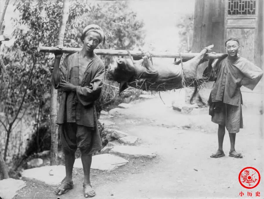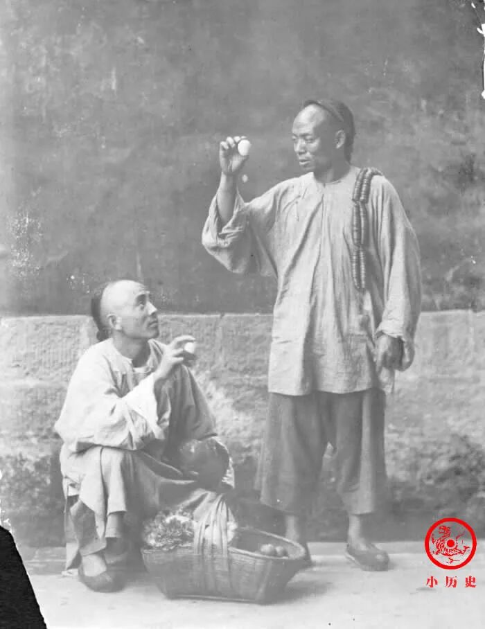 小贩不仅带来了一篮子鸡蛋,还抱来了下蛋的母鸡,不知是展示鸡生蛋的原理还是连鸡一起卖掉?顾客肩上扛着1000文铜钱,正在检查鸡蛋的品质,与小贩讨价还价。根据《(四川)合江县志》记载,1875年当地一个鸡蛋卖28文铜钱,照片拍摄的具体时间地点不详,但价格可以参考,不至于浮动太大。