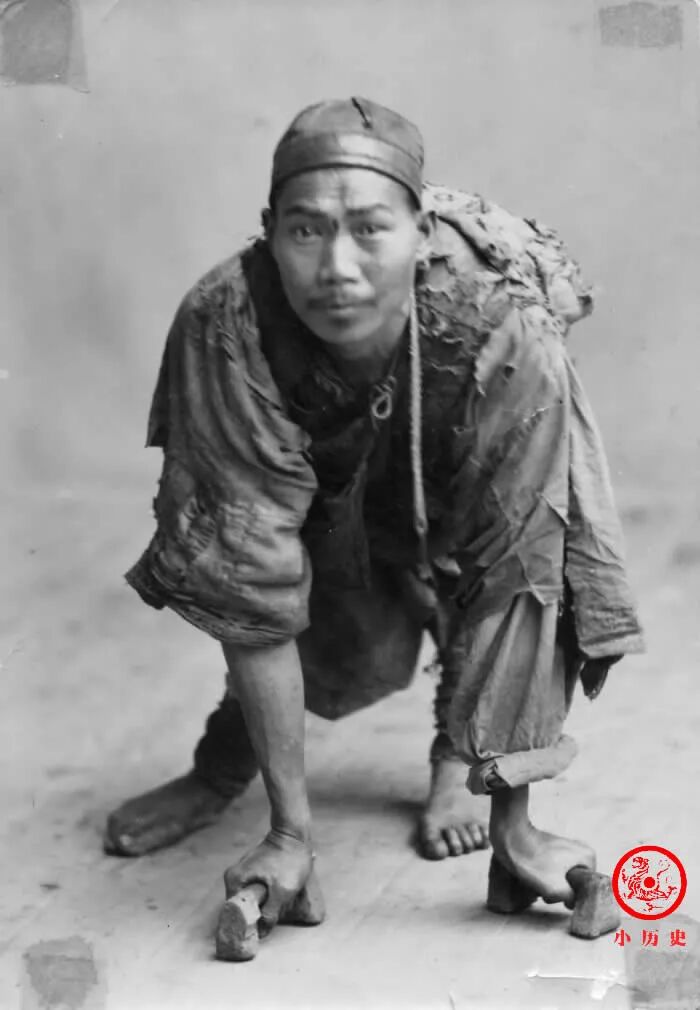 此人无法站立,行走时手脚并用。他是被社会抛弃之人,无家可归,平时以乞讨为生。