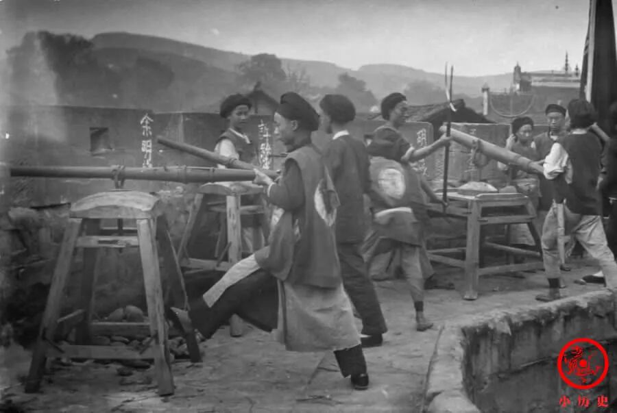 照片拍摄于1910-1911年保路运动和辛亥革命时期,这些士兵并非朝廷编练的新军,而是地方官府组织的勇营。他们使用的武器极其落后,有人拿着三角叉,有人操纵着火铳,再加上平时没什么训练,战斗力当然非常虚弱,根本难以抵挡革命军的进攻。