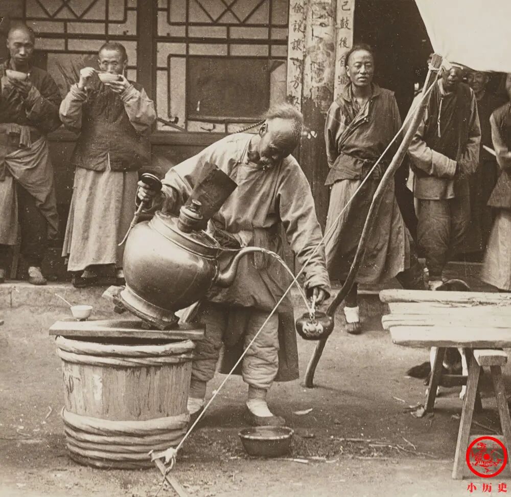 旧社会人们对茶水的消费有两个档次:一个是茶馆,富贵之人在这里品茶、休闲,还能听曲听戏;一个是流动性的茶摊,为过往行人解渴,价格实惠。照片中场景即为第二种情况。