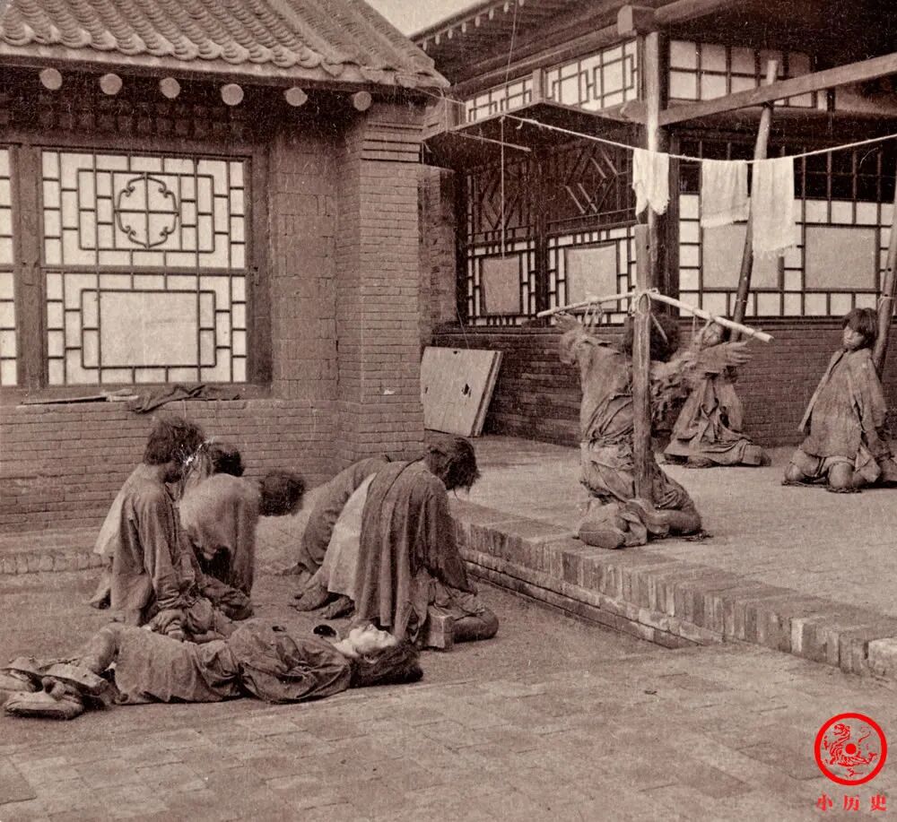 这张照片记录了清朝地方衙门对涉案人员施行酷刑的真实场景,他们衣衫褴褛、头发脏乱,处境可怜。已有人熬不住身体的折磨,晕倒在地。