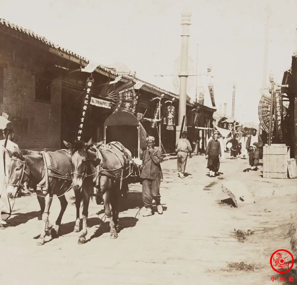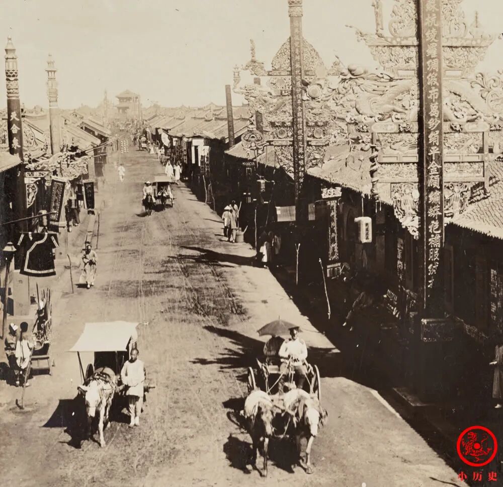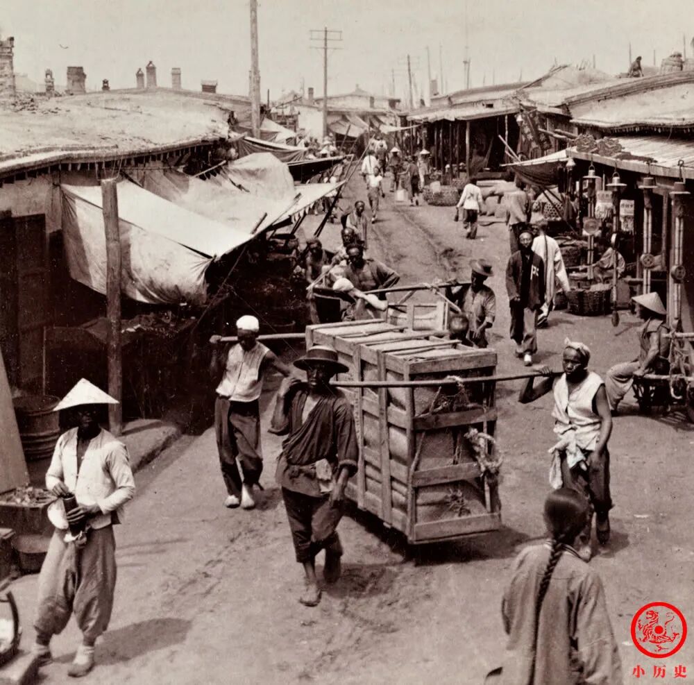 我们可在这张照片看到两家洋货店,专卖烟草、药品、棉织品等进口货物。晚清洋货店在营销方面非常讲究,徐珂《清稗类钞》记载:“凡交易而不成者,亦怡悦其颜色以对之,如交易已成,则于买主临行时,必致声道谢,虽数十钱之易,亦然。”