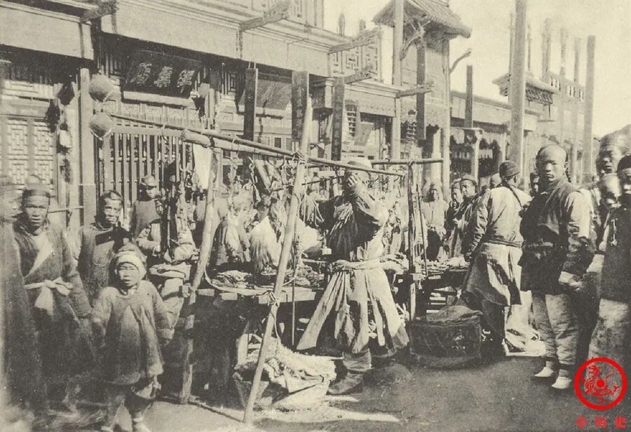 街边的摊位围了很多人,此时都齐刷刷地看向镜头。后面的洋药店已经关门,当年义和团运动的目标就是“灭洋”。