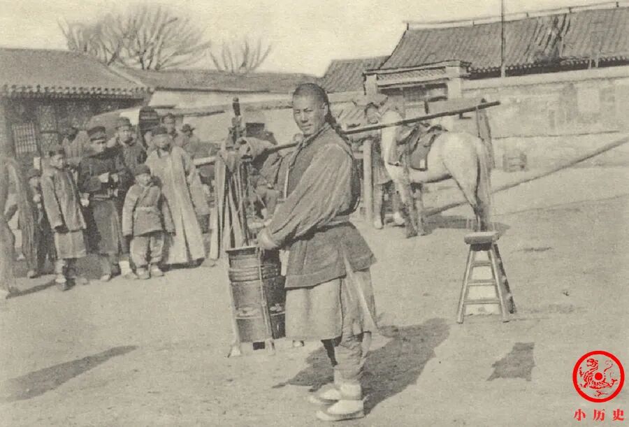 看到这个场景,大家有没有想到一个歇后语?“剃头挑子——一头热。”师傅的扁担一头挑着凳子,凳腿间夹置抽屉,放工具,这是凉的一头;一头挑着小火炉和水盆,正是热的一头。