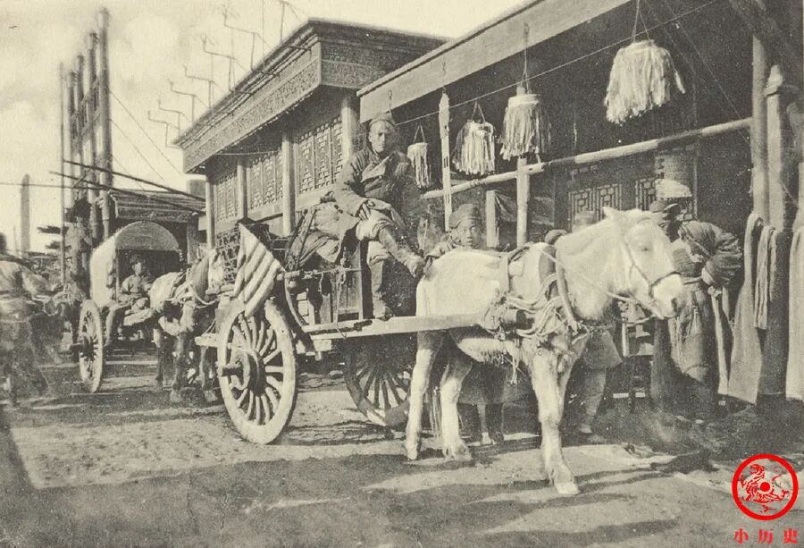 马车上插着一面外国旗,可能被联军征用了,也可能是车夫用以自保。