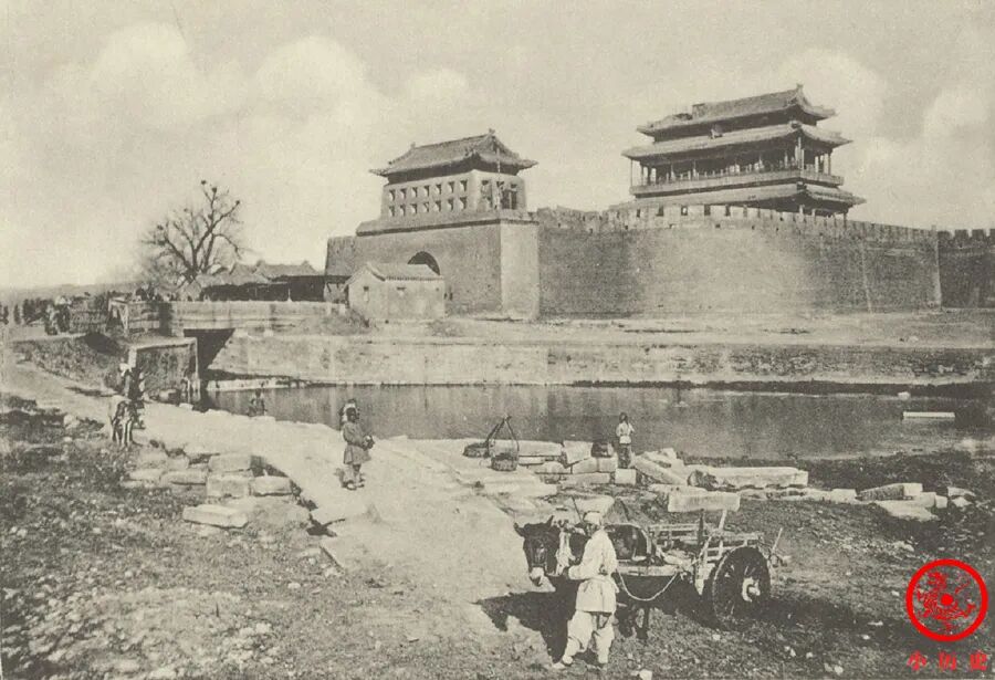 照片中城楼和箭楼都有受损的痕迹。英军在永定门城楼下凿开了西侧的城墙,修建了直至天坛西门的铁路,以方便火车往来运输物资。