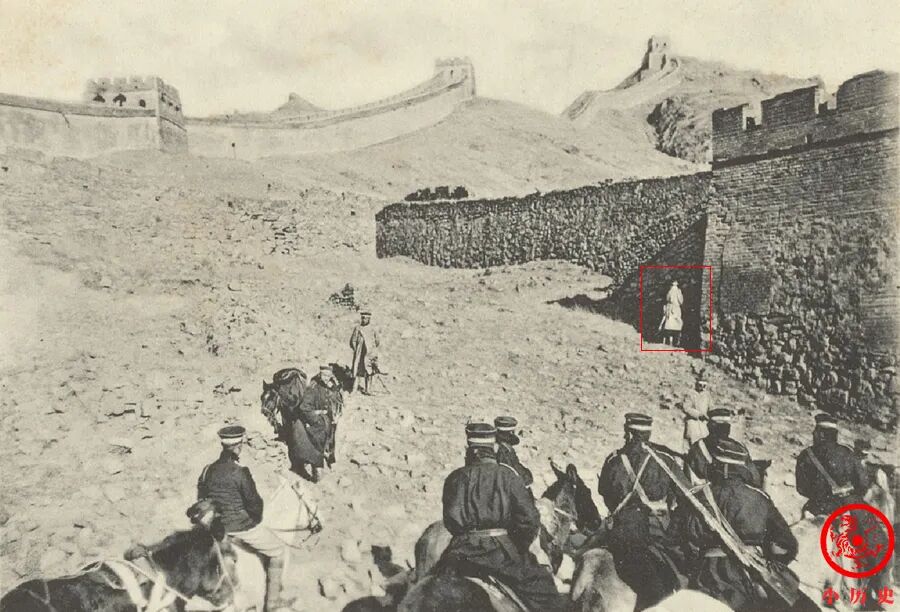 八国联军占领北京后,德军继续西进,侵略山西。此时长城附近已无清军驻守,进入山西的路途中只遇到轻微抵抗。大家注意照片标红框处,一个德军士兵正在墙根小便。
