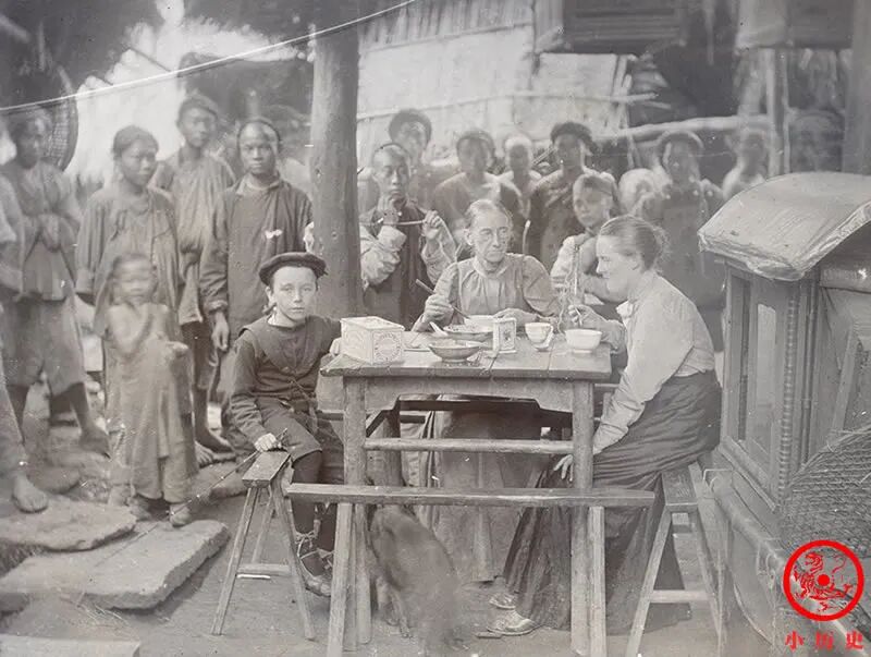 晚清时期,内陆地区对外交流极少,所以当外国人出现,当地百姓难免好奇地围观。人群中有两个身穿兵勇服装的人,可能是地方官府派来保护这几位外国人的。