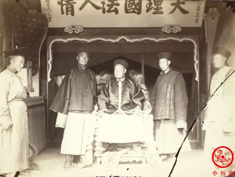 这是一位晚清县太爷(知县)的排面,架势十足。他头上的匾额写着“天理国法人情”六个遒劲有力的大字,意为审理案件要顺应天理、执行国法、合乎人情。清朝县衙普遍悬挂这六个字,体现出身兼法官的知县所应坚守的断案原则。