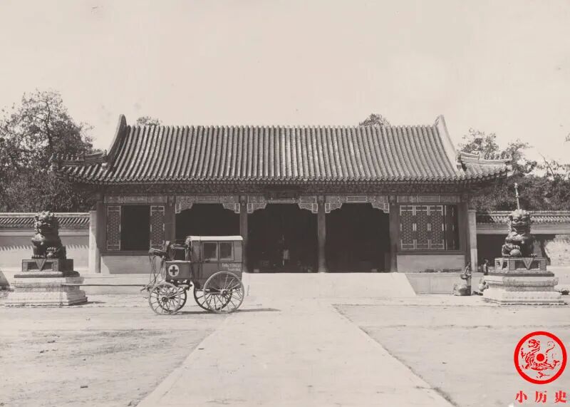 这辆医护车由骡马拉动,属于一家外国医院。它出现在皇家园囿门前,有两个可能:一是被请来给皇室成员看病;二是1900-1901年八国联军占领颐和园期间,给里面的联军士兵看病。通常来说,颐和园都有清军守卫宫门,照片里的场景空空荡荡,猜测第二种情况的可能性更大。