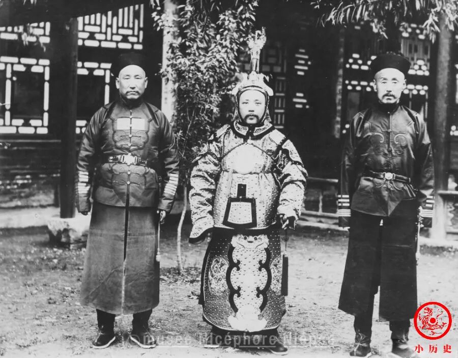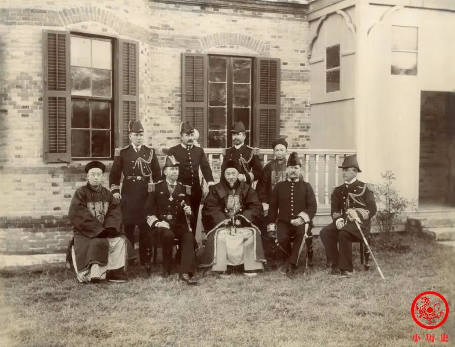 照片中将领自左往右依次为:统领奉军记名提督左宝贵、总统铭字马步全军记名提督刘盛休、统领楚军马队记名提督徐邦道。三人均曾率部参加甲午战争,其中左宝贵壮烈牺牲。