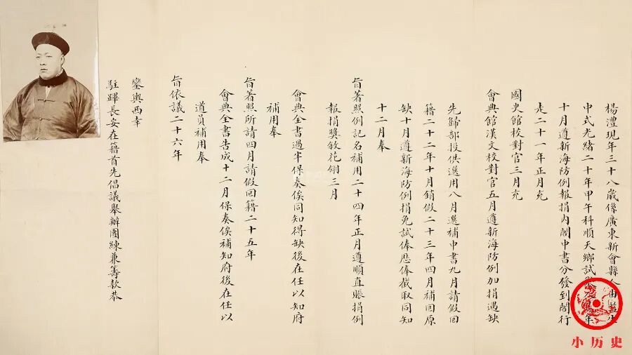杨沣是广东新会县人,时年38岁。他于1894年考中举人后靠“捐纳”(花钱买官)走上仕途,此后多次加捐,最终获得候补道员(四品)的官衔。实际上,自捐纳以来,他没有获得实际的官位,只获得了候补官衔和临时性的办差。不知道在这个过程中,他是否收回了买官花掉的钱财?